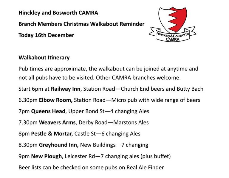 The Annual Hinckley Christmas Walkabout took place on 16th December and was very well attended and supported by the pubs on the above itinerary.
